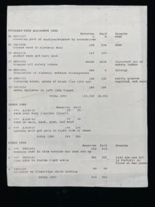 A 1990 document, pictured here, records a variety of accidents at a mill or factory in Lewiston, Maine. The documented workplace injuries range from a hand caught in an elevator door to being bitten by leather fleas. Chemical exposure was a notable hazard, evidenced by one case of injury resulting from the inhalation of diphenyl methane diisocyanate (methylene diphenyl diisocyanate). This chemical is commonly found in industrial spray foam sealants, adhesives, and coatings. Given the history of shoe manufacturing in the area, this exposure may have been connected to adhesives used during production.