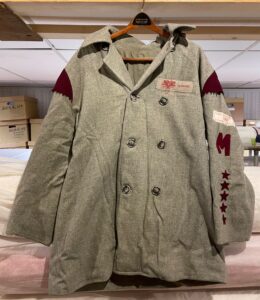 This uniform jacket, features the signature gray and scarlet colors of Lewiston’s Le Montagnard snowshoe club. Founded in 1922 by Louis-Philippe Gagné, Le Montagnard was the first club of its kind in Lewiston. Each snowshoe club had a unique uniform, identifiable by its distinct color scheme and patches. For example, while Le Montagnard’s colors were gray and scarlet, another club, Le Diables Rouges, wore red and white. Typically, a complete uniform ensemble included a jacket with epaulettes, pants, a waist sash, a tasseled hat, long socks with tassels, insignia, and patches.
