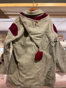 This uniform jacket, features the signature gray and scarlet colors of Lewiston’s Le Montagnard snowshoe club. Founded in 1922 by Louis-Philippe Gagné, Le Montagnard was the first club of its kind in Lewiston. Each snowshoe club had a unique uniform, identifiable by its distinct color scheme and patches. For example, while Le Montagnard’s colors were gray and scarlet, another club, Le Diables Rouges, wore red and white. Typically, a complete uniform ensemble included a jacket with epaulettes, pants, a waist sash, a tasseled hat, long socks with tassels, insignia, and patches.